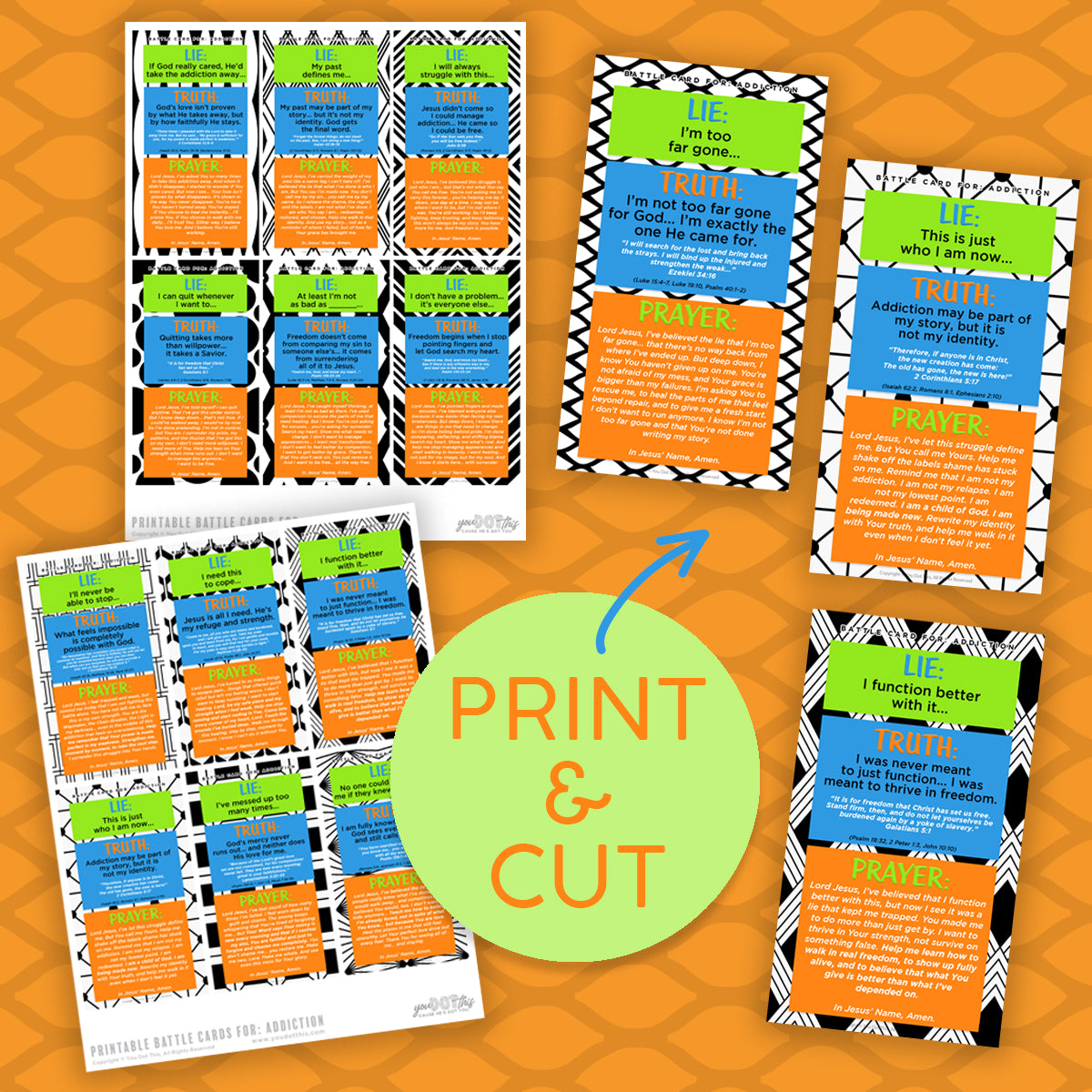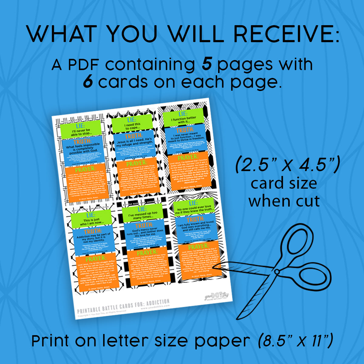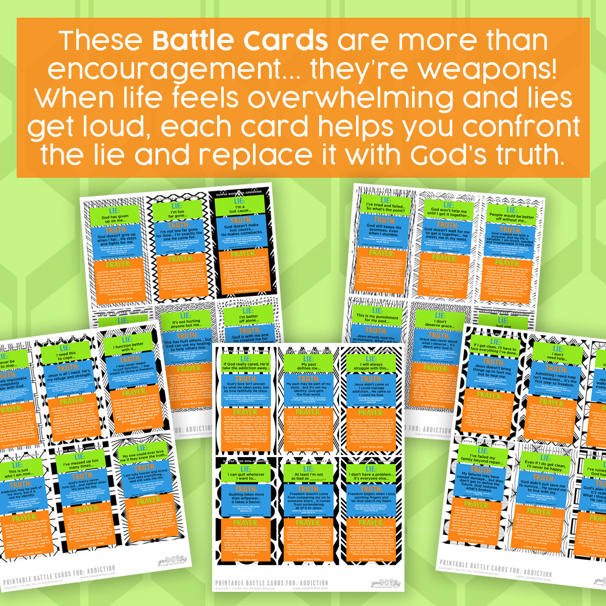 - 30 Battle Cards for Addiction, each addressing a different and specific lie related to addiction- paired with biblical truth, Scripture and a short prayer