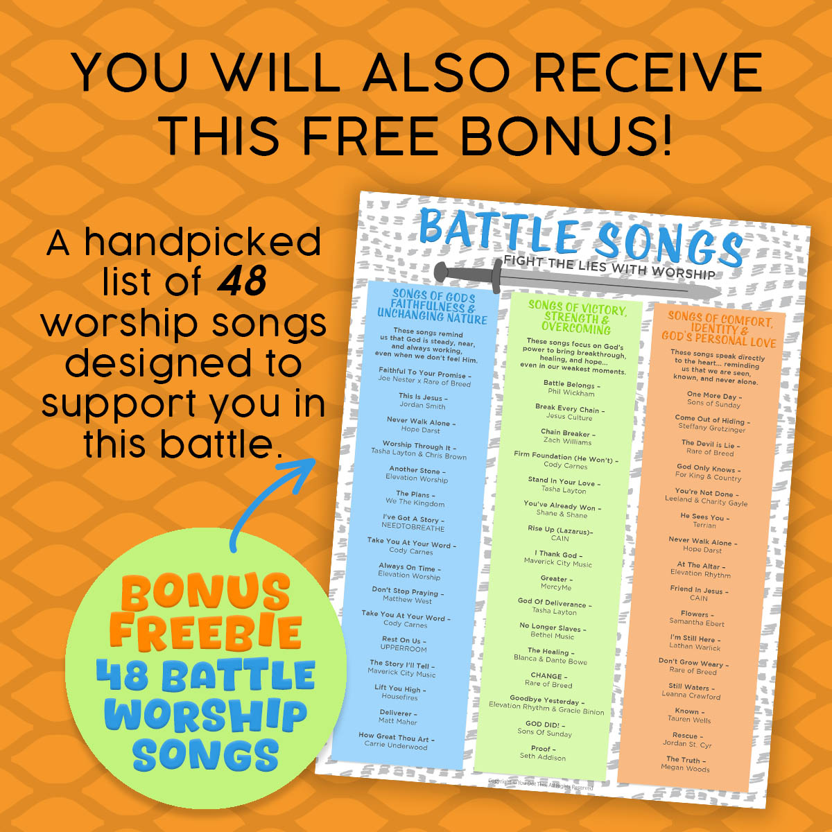 BONUS: Battle Songs PDF with worship music curated to strengthen your spirit, quiet the lies and remind you that freedom is possible through Christ