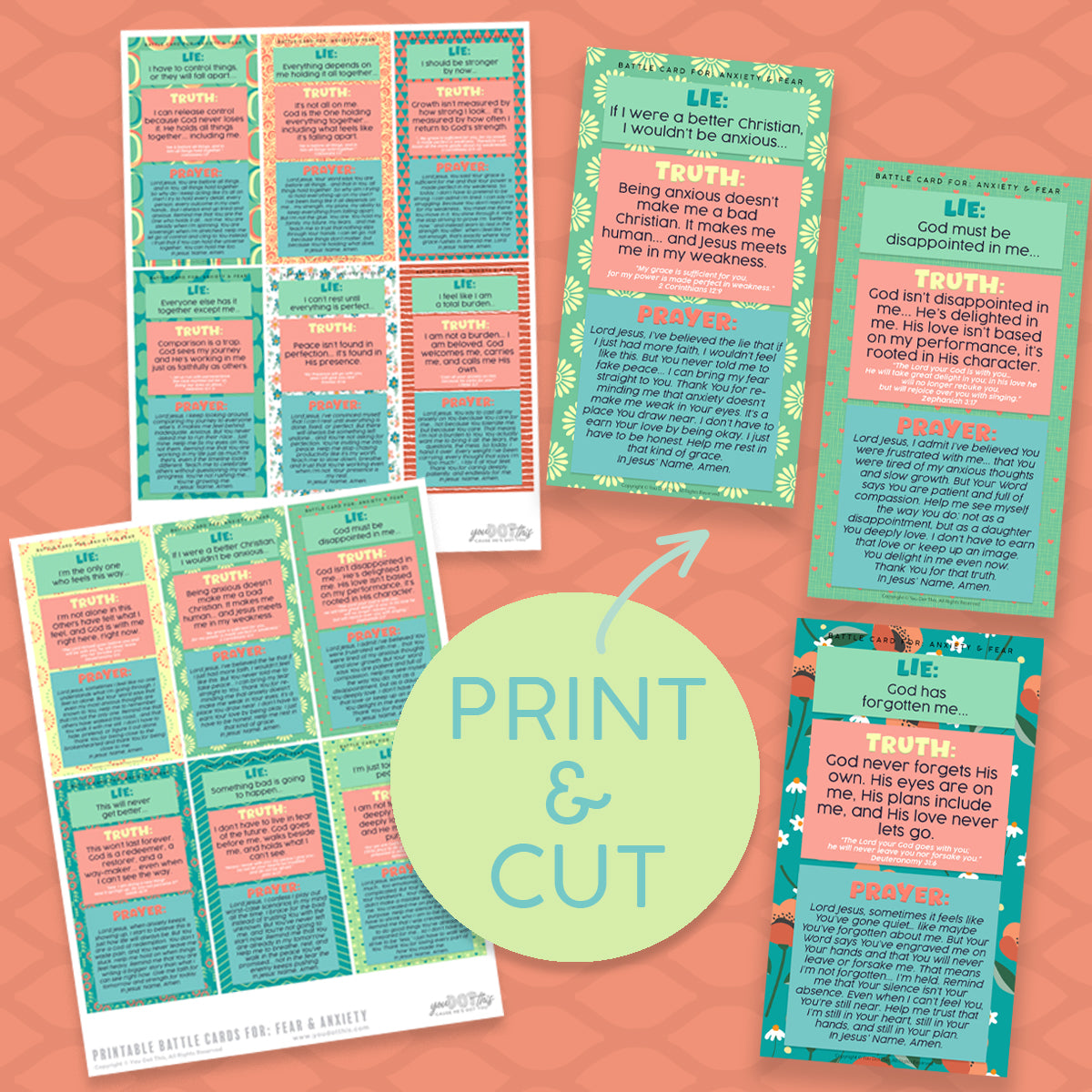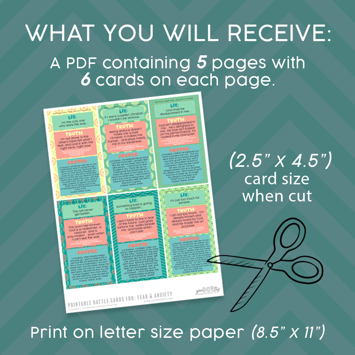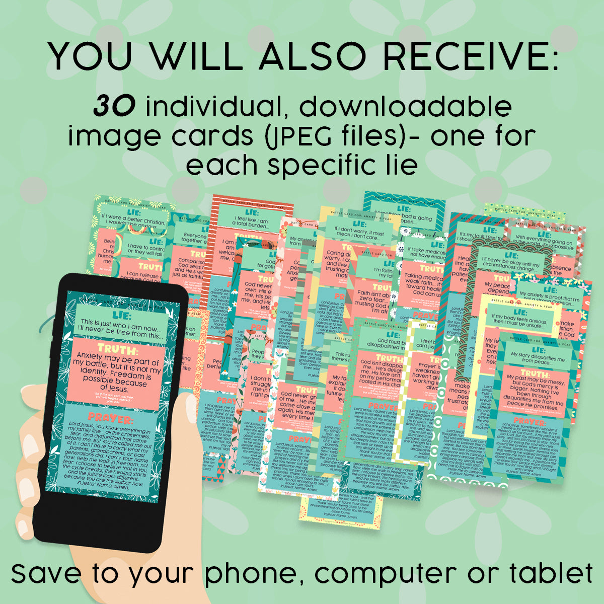 - 30 Battle Cards for Anxiety & Fear, each addressing a different and specific lie related to anxiety or fear - paired with biblical truth, Scripture and a short prayer
